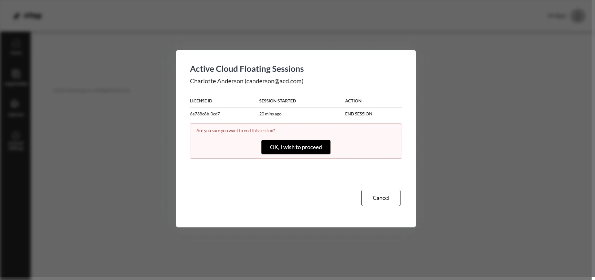 You can view who has checked out the floating license by clicking on the End Sessions button; this will open up a modal with the User and Session information along with the End Session button for you to terminate the session and retrieve the Floating license.