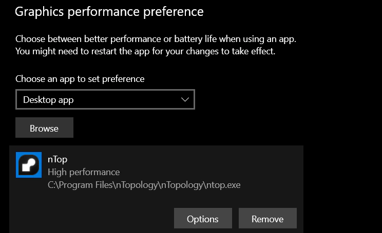 Method 1: This method will overwrite the NVIDIA settings from Method 2. You may need to use this method if your GPU isn’t being selected in nTop To change your graphical performance settings for nTop- Launch the Settings App.