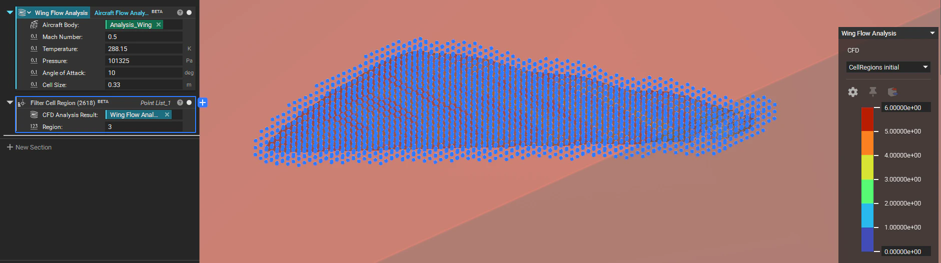 - Filter Points: Add the Filter Cell Region block. Input the CFD Analysis Result and set the Region ID (e.g., 3) to generate a list of points around the aircraft body.