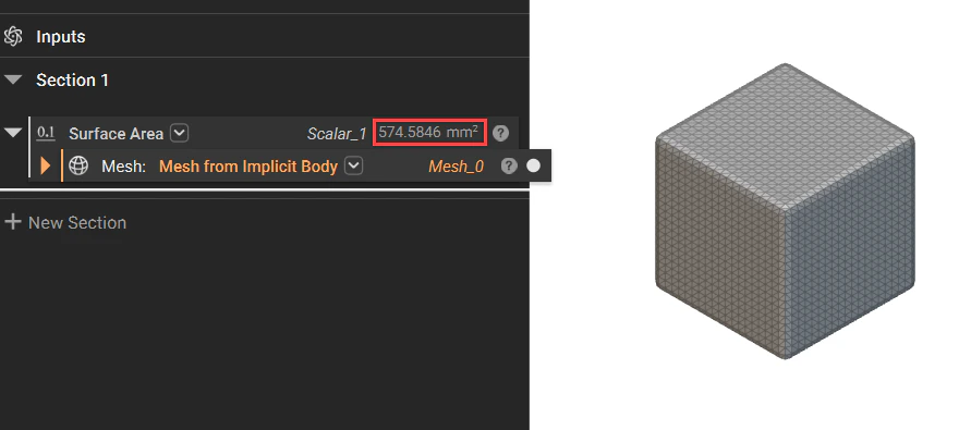 - Look at the calculated area in the top right of the block. This value is the surface area.