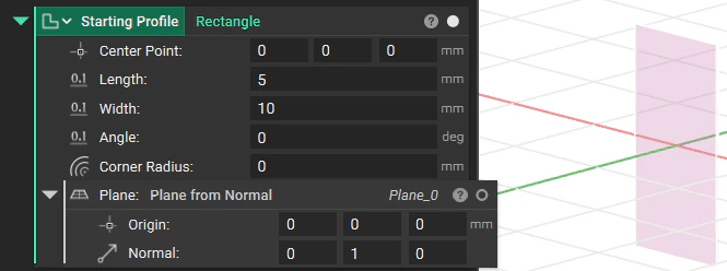 Before applying this to an airfoil, let’s look at a simple example: tapering a rectangle along the Y-axis. We begin with a Rectangle on the XZ plane. To create a loft, we first must define a Ramp along the Y-axis from Y=0 to Y=20mm, which applies the scaling factor for the rectangle.