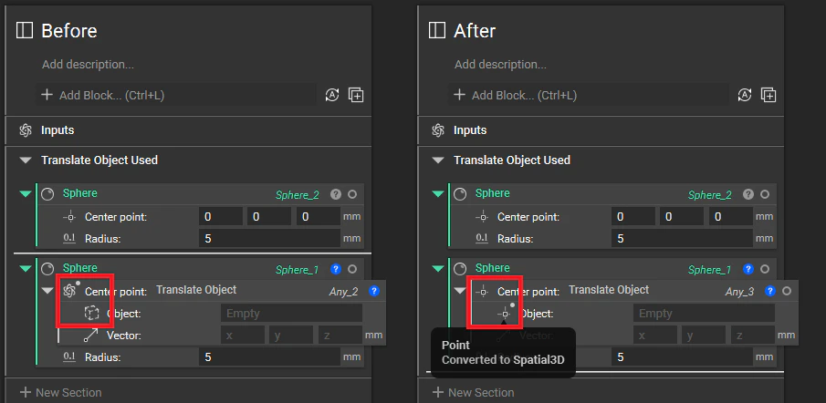 When using an interface type in a block input, it will convert to the appropriate type. Below is an example of this in the old system (left) and the new system (right). In the new system, the Translate Object is converted from a “Spatial3d” type to a “Point” type.