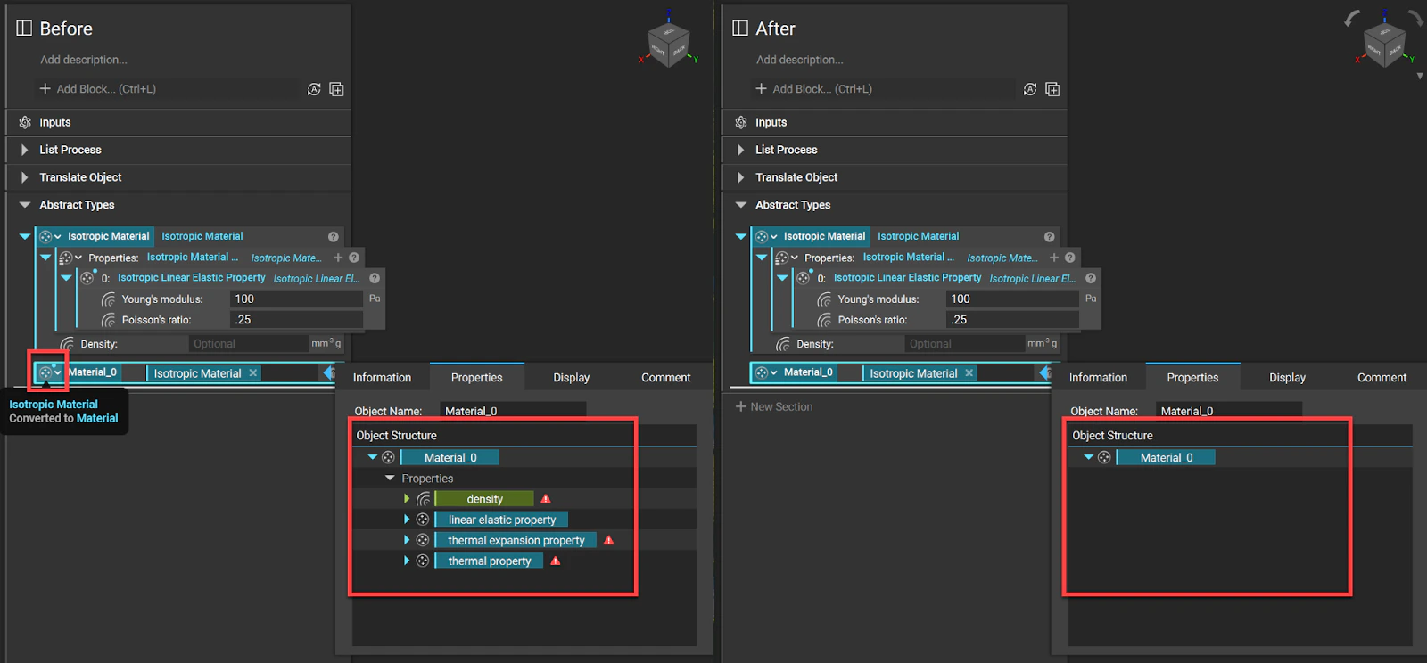 When a variable can hold objects of different types, an abstract type such as a “Material” or “Spatial3D”, it will no longer be possible to use that variable as one of those specific types; it can only be used via the functionality common to all possibilities. This will allow users to change the type held in that variable without breaking the downstream workflow. Below is an example of what this looks like in the old system (shown below on the left) and the new system (shown below on the right). You will no longer be able to reference properties for abstract types like “Material.” If you need to reference their properties, change it to a concrete type using the type dropdown at the block’s top left.