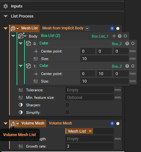 In the new system, to place the Mesh List variable in the Volume Mesh variable, you must change the Volume Mesh type to a “Volume Mesh List” via the type dropdown in the top left of the block (shown below).