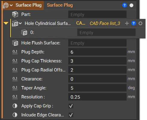 Step 2: Select the Cylindrical and Flushed Surfaces you would like to plug