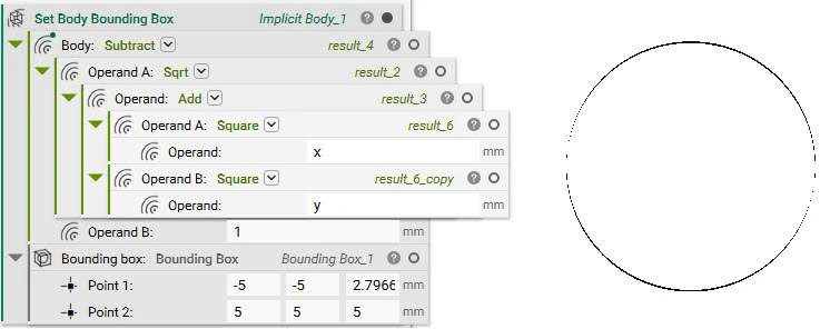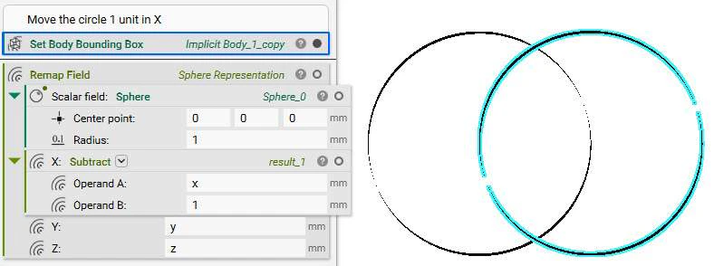 The unit circle centered at the origin has the equation sqrt(x2 + y2) – r = 0 . We want to shift this circle by +1mm along the x-axis, so the new equation is sqrt((x-1)2 + y2) – 1mm = 0mm .
