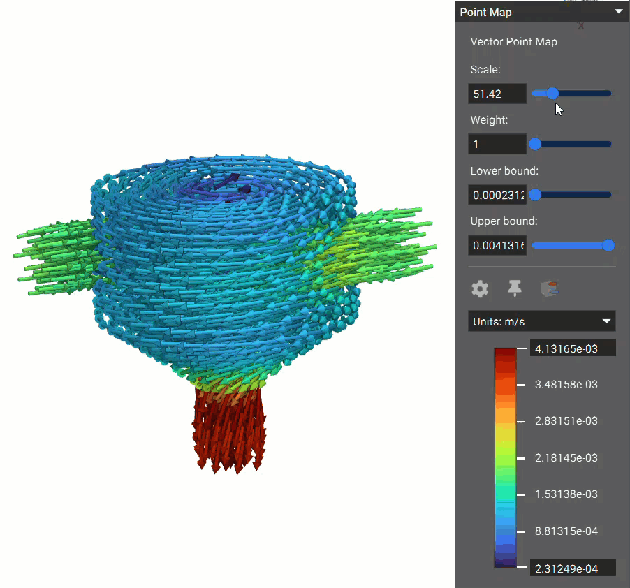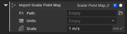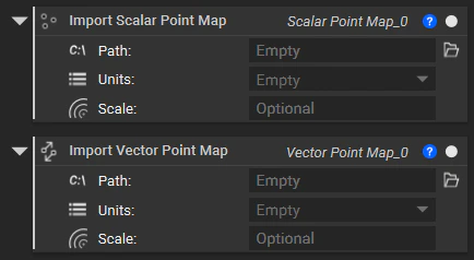 After generating the .csv file, we use the Import Scalar Point Map or Import Vector Point Map blocks to bring in the appropriate Point Map. Image 1 below shows both blocks. If importing a Scalar Point Map, ensure your format is X, Y, Z, S, where S is the desired value at each point. If importing a Vector Point Map, ensure your format is X, Y, Z, U, V, W, where the U, V, W represents the vector at each point.