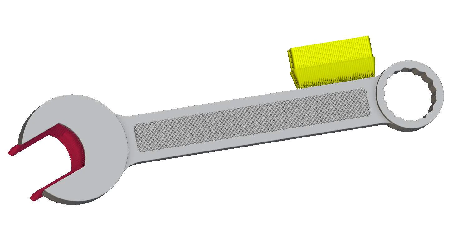 Using the Inner FE Mesh and Outer FE Mesh variables in the starter file, set up and run a Field Optimization to generate a latticed wrench. Minimize structural compliance of the part under the loading conditions below while constraining the inner body to a volume fraction of less than 0.3.- Apply a Force (yellow arrows) of 10,000N in the negative x direction to the area selected in the provided Force Boundary