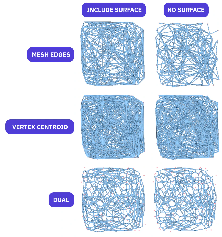 - Dual: Creates a vertex at the centroid of each mesh face and creates a connecting beam to the next closest mesh centroid.