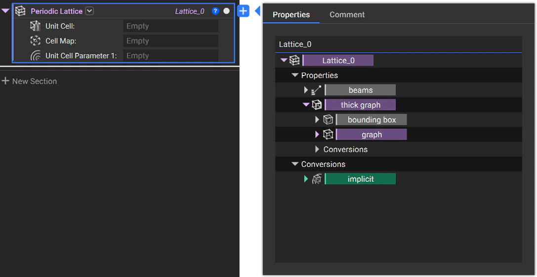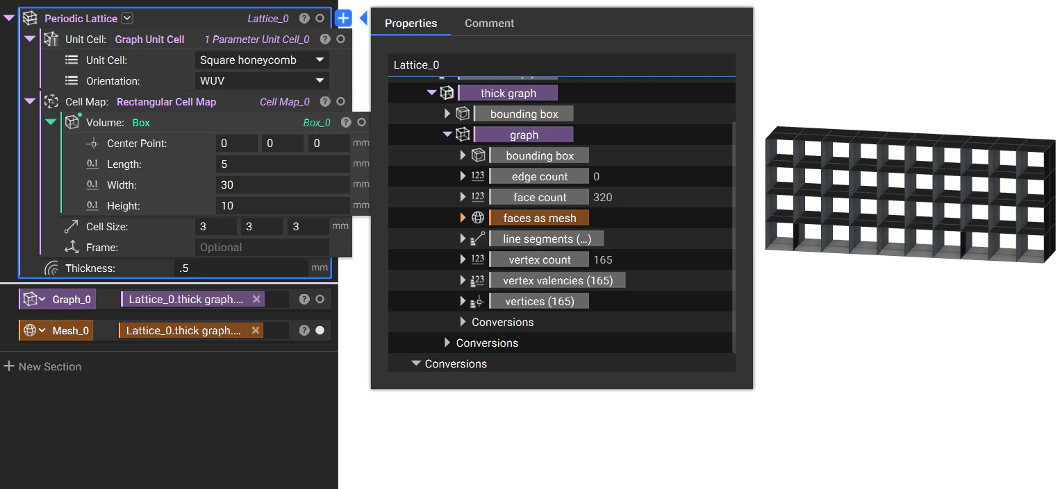 The term “lattice” refers to any structure made from some fine pattern of material and air. In nTop, we have Graphs and Lattices. A graph type is a structure composed of beams with no thickness. A lattice can be a TPMS Structure, a custom pattern, or a graph with thickness included. Later in this course, we will use the Periodic Lattice block to generate lattices in nTop.Lattice Properties