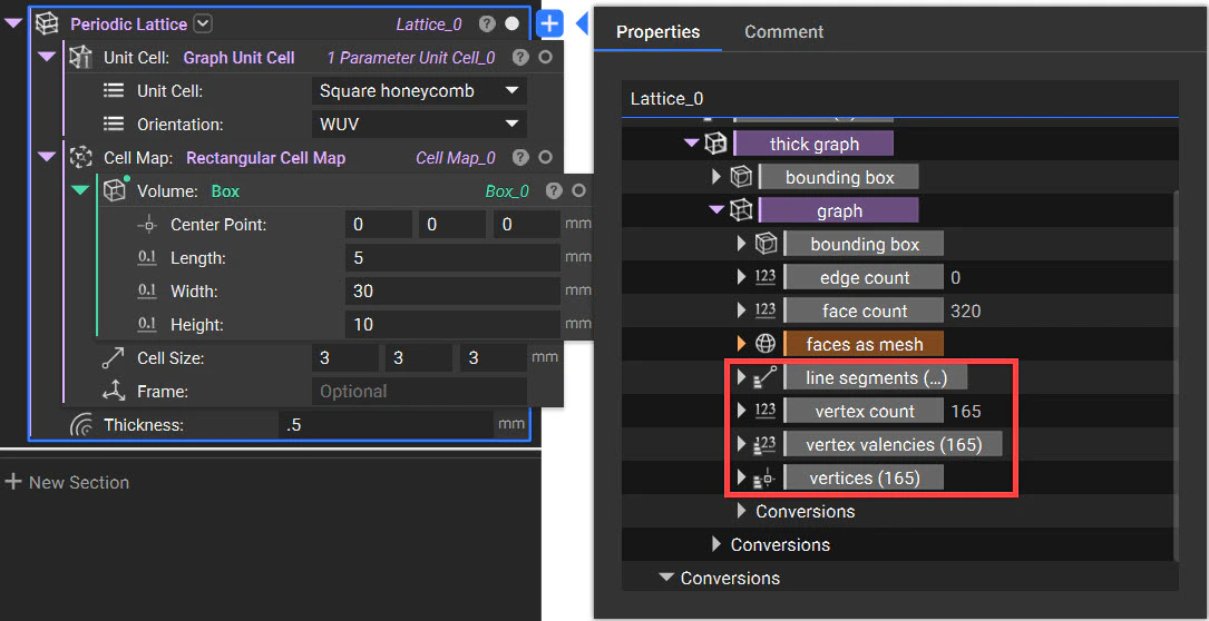 The key properties specific to graphs include line segments, vertex count, vertex valencies, and vertices. Line segments refer to the different beams that make up the lattice. Vertices can be used to create uniform points across a body and in courses such as our 311: Ribbing and Texturing course.