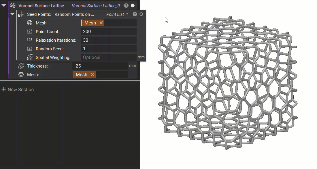 Along with the properties found with a lattice, the Voronoi Surface Lattice has one additional property: voronoi surface patches. This contains a list of meshes split by the Voronoi structure. You can use these surface patches with an Implicit Body from Mesh block and a Thicken Body block to fill in regions of the lattice structure.
