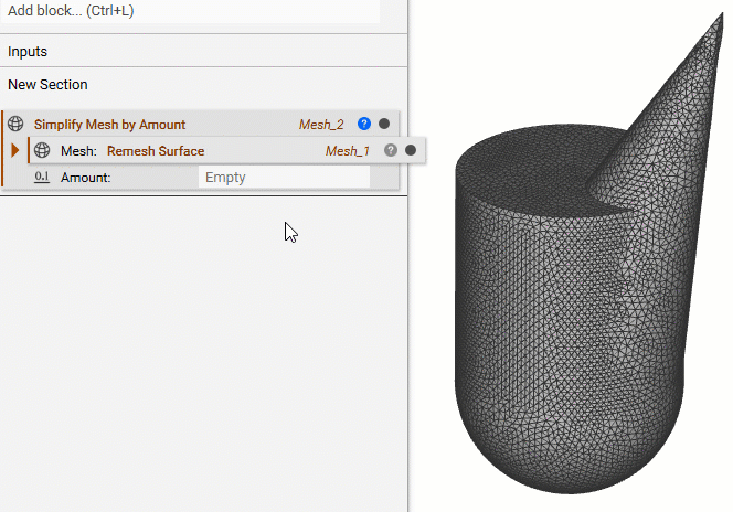 The Simplify Mesh by Amount reduces the number of triangles on the surface mesh depending on the amount entered (ranging from 0-1, but not including 0 or 1). This block helps shrink the size of the file. When simplifying, it does not consider surface tolerance (the distance between the original input mesh surface and the new surface).