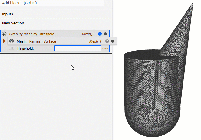 The Simplify Mesh by Threshold reduces the number of triangles on the surface mesh. The block ensures that the distances between the surface input mesh and the surface of the new mesh are below the defined Threshold. This block helps shrink the size of the file.