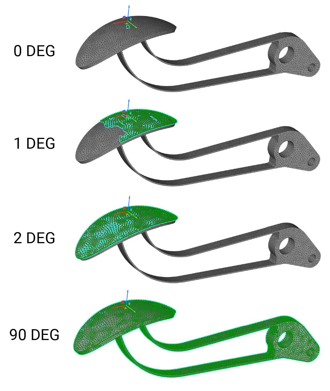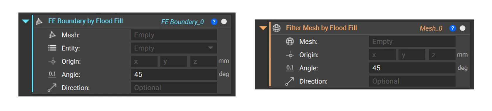The angle defines how many entities to select by comparing the normal of face0 (seed entity) with all neighboring faces. If the faces are below the tolerance angle, they will be selected. It is helpful when selecting entities on curved surfaces. If the angle is x degrees, the Flood Fill will choose all entities with an angle of up to but not including x degrees between them and the normal of face0. Watch below to see this behavior.