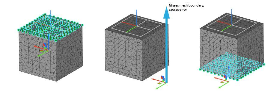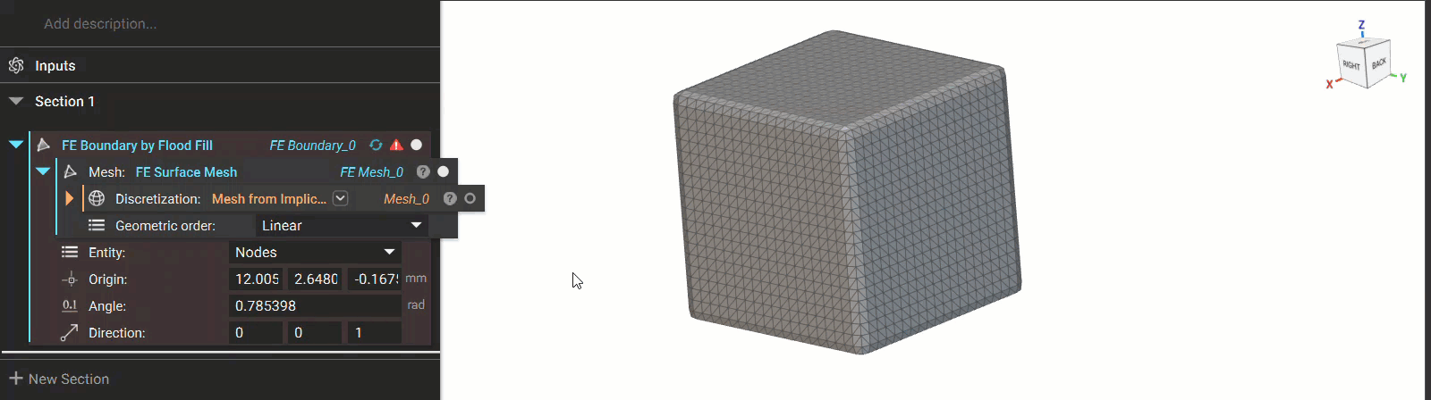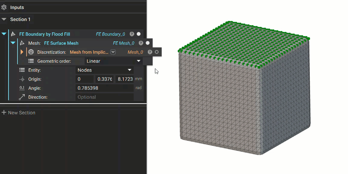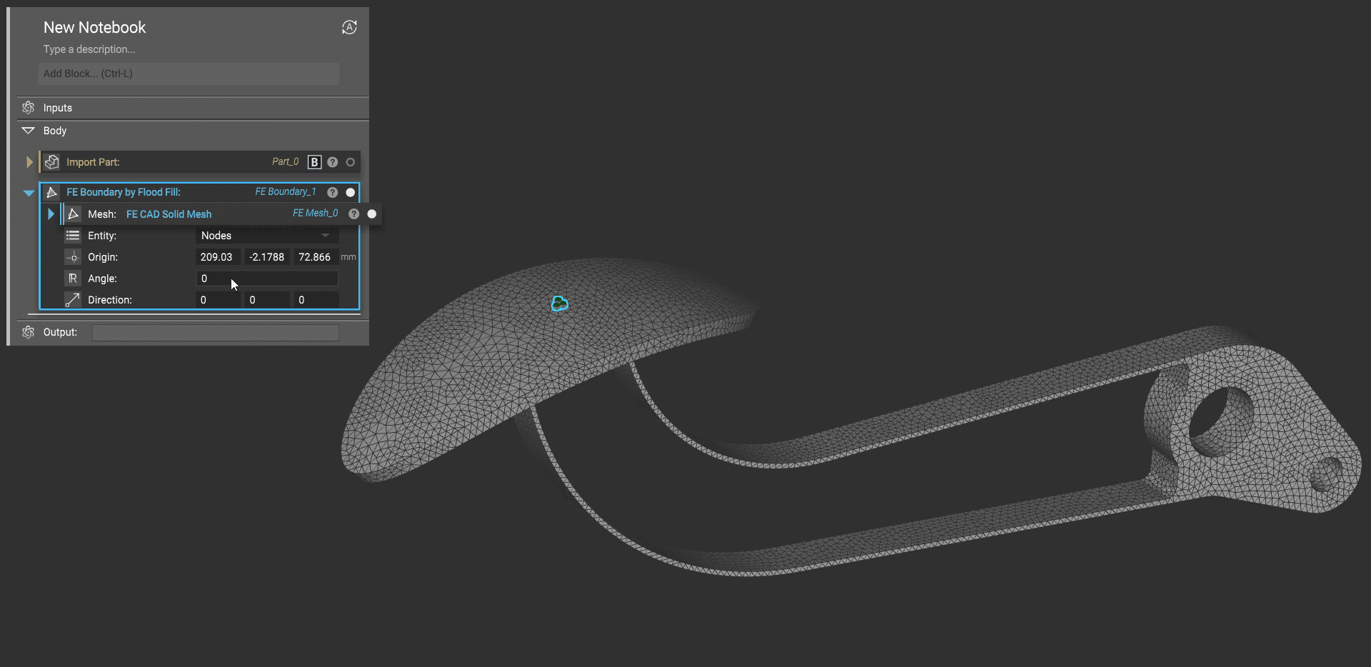 You can also select a mesh face in the 3D scene and flood to the boundary. Right-clicking on the mesh launches a context menu with the option to perform the flood fill operation. The option works for both an FE Mesh or Mesh object. The flood fill operation creates a block in the Notebook with the associated inputs, so your flood selection is preserved. Selecting the FE Boundary by Flood Fill context menu floods the mesh faces in the vicinity of the selection point.
