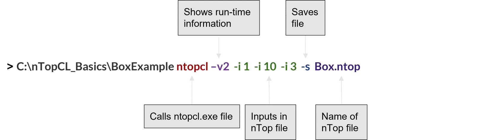 The first method is to enter the input variables directly into the command line and is therefore limited to only scalar and text input types. This can be sufficient if you are working with a very simple Notebook. Once in the correct directory, you can use the following command to execute an nTop Notebook in that folder with desired input variables: