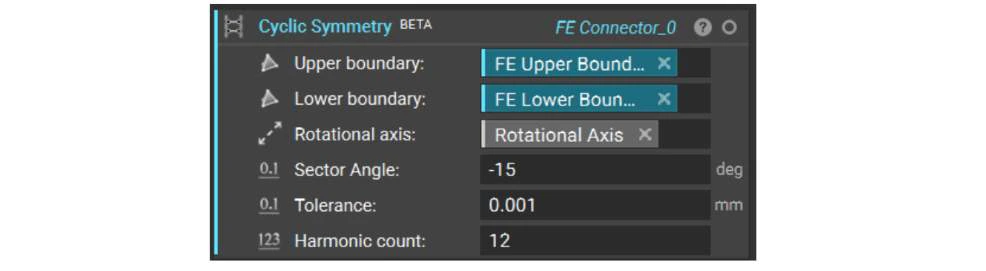 The Cyclic Symmetry block creates tie constraints between an FE Mesh’s upper and lower boundaries. To reduce file size and drastically reduce the run time for parts exhibiting cyclic symmetry, a single sector can be used to assume consistent results for all identical segments of the revolved feature. Currently, the Cyclic Symmetry block only works with parts that do not contact the axis of revolution.