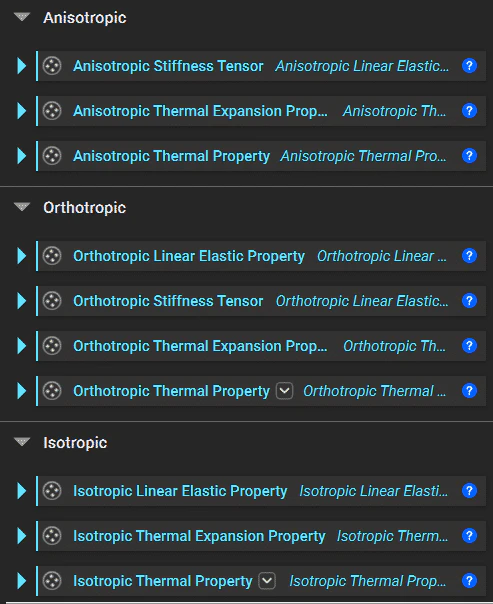 For isotropic and orthotropic material blocks, you can add a Linear Elastic Property. The anisotropic and orthotropic materials have Stiffness Tensor blocks. For all of these materials, you can add Coefficient of Thermal Expansion and Thermal Property blocks. Add the Property blocks to the Isotropic Material Property List. Use the ‘+’ to add more inputs to the list. All of these available blocks are shown in the image below.