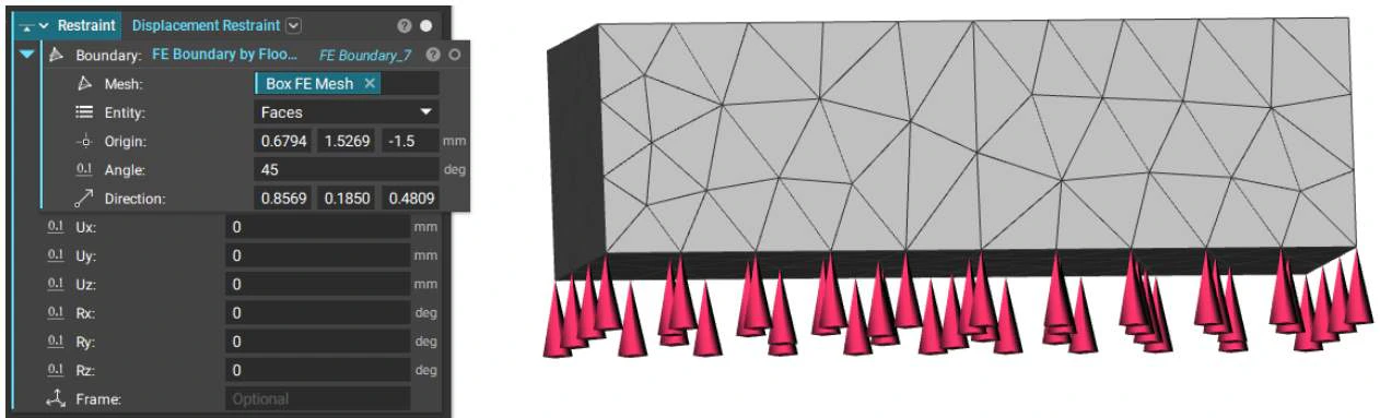 A Displacement Restraint restrains the selected boundary entities in up to six degrees of freedom. If an input is empty, the corresponding degree of freedom will be unrestrained. We also have Beta version of this block that takes CAD faces if you are working with a CAD body.