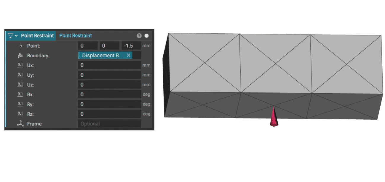A Point Restraint applies a displacement restraint to a remote point attached to selected boundary entities using rigid body elements.