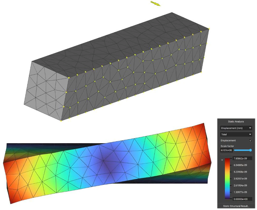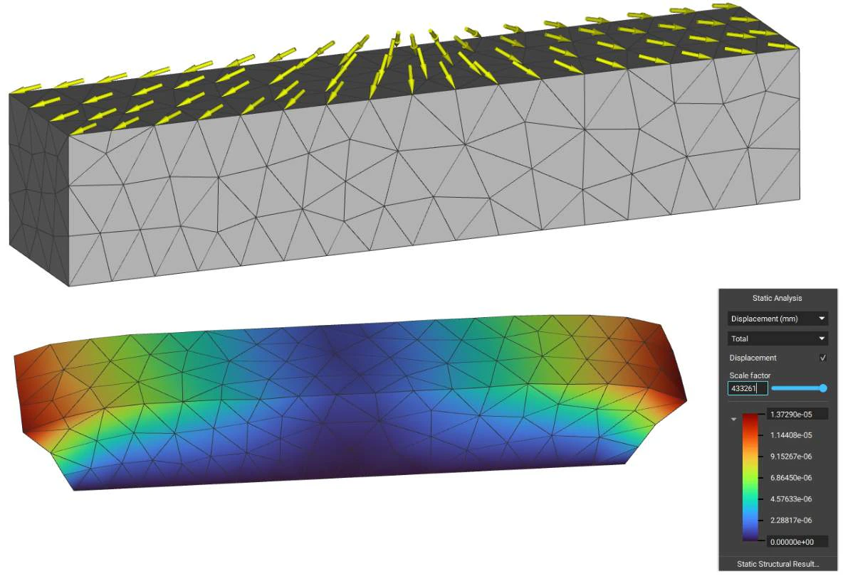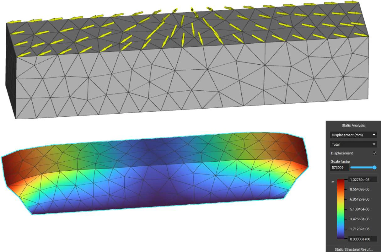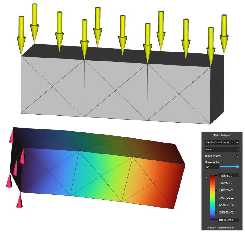 The Force block is a Boundary Condition for analysis that applies a force over a selected boundary. The force is evenly distributed over the selected entities. The Force block requires a Boundary to choose where to apply the force, and a Vector, to determine the magnitude and direction of the force. There is an optional input of a Frame, allowing for further definition of the orientation of the Force.The downward arrows in the image represent the -1000N of Force acting in the negative Z-direction over the box. If you want more control over the direction of the force, you can edit it using the ‘Frame’ input.