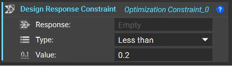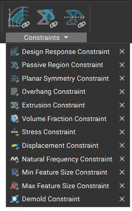 A defined design response drives the TopOpt result. The most commonly used constraint applies a minimum or maximum bound to a design response, such as compliance, volume fraction, displacement, or stress.Choose a design response that must be restricted/constrained in the topology optimization.You may choose any of the design responses to constrain, ensuring the solution meets and falls under or exceeds your quantitative restriction (dependent on your choice), for example: