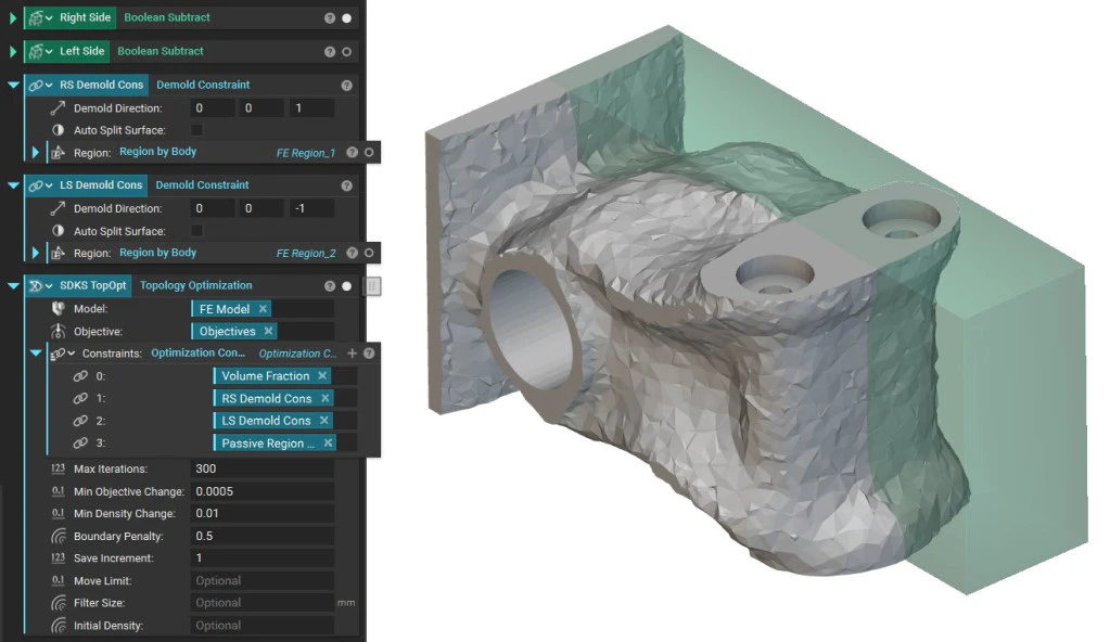 The Demold Constraint block ensures the manufacturability of the final results for castings or plastic injection molding parts. The block prevents overhangs or undercuts based on a defined Demold Direction. You can use this block for a single draw, a split draw with a variable surface, or a split draw with a known surface.