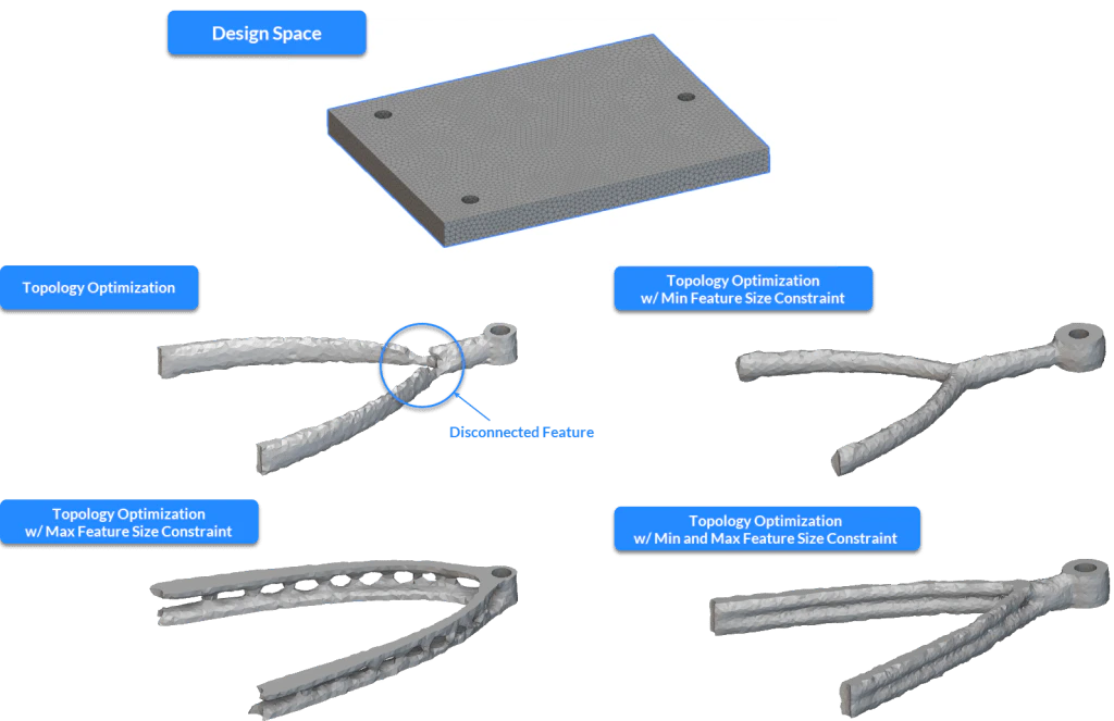 The Min Feature Size Constraint block can be used as a constraint in the Topology Optimization block to maintain the feature sizes of the optimized design space above a user-defined value. This block is typically used to correct feature disconnections in the optimization result and to enforce a minimum feature size limit to the design space based on requirements from a manufacturing process.