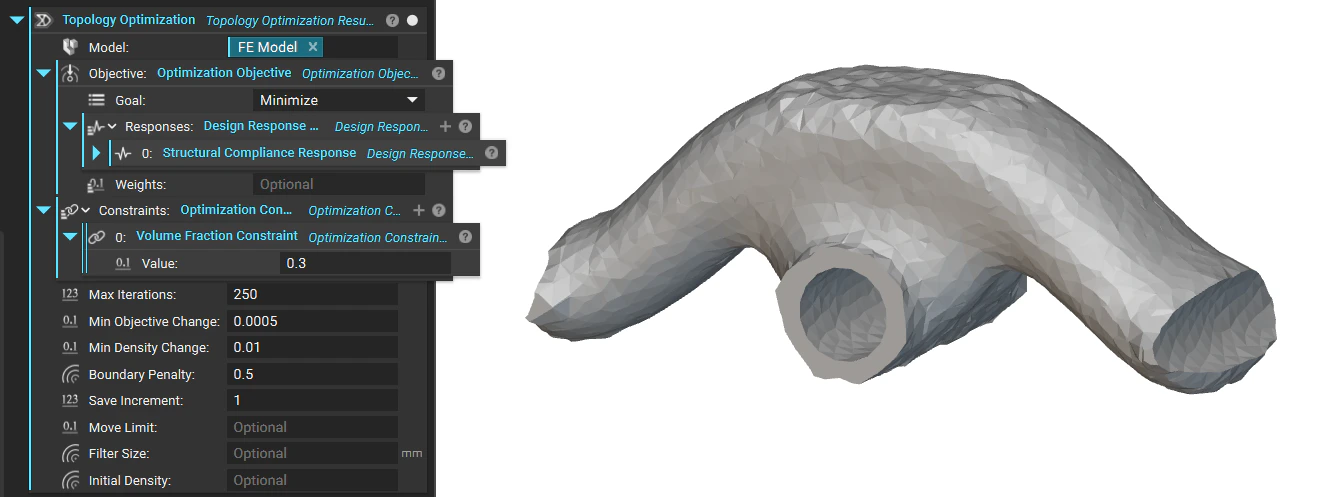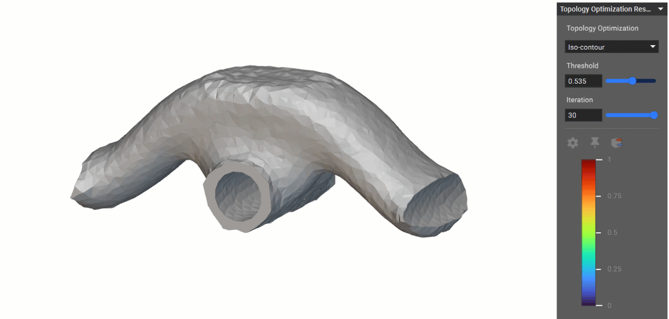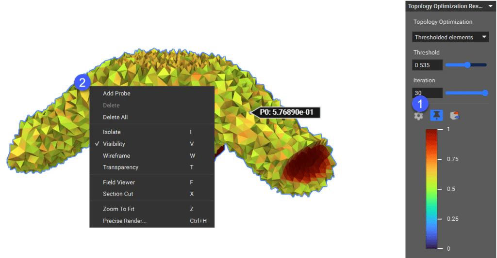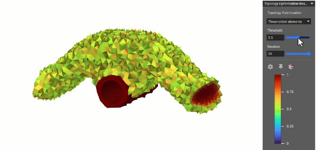 The Thresholded elements option in the Topology Optimization HUD lets you view density values assigned to all elements in the design space. Use the Threshold slider only to view elements with a value higher than the specified threshold. After the Topology Optimization is complete, you can also probe the density values of elements. The desired locations can be identified by moving the probe across the threshold plots and pinning them through a right-click selection menu. This feature can determine the best combination of the threshold parameter and iteration to output the final optimized part.