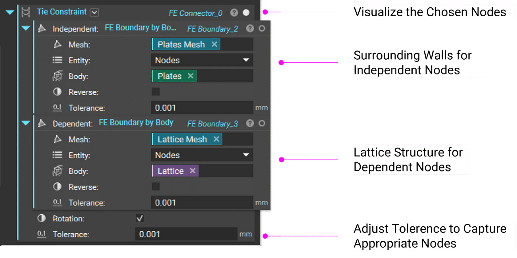 Use the Tie Constraint block to join the independent and dependent nodes of the solid and lattice components together.