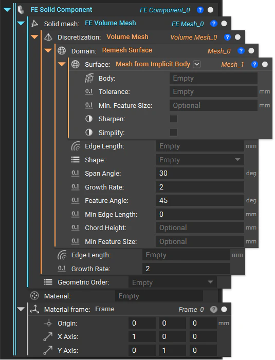Non-lattice geometry, such as the surrounding walls, can be meshed as a normal FE Volume Mesh and used as input for an FE Solid Component, then joined with the lattice component via a connector. This combination of blocks converts your implicit body into a surface mesh, re-mesh it to be suitable for FEA, and then generates and discretizes a volumetric mesh with assigned nodes. If you have a CAD part, converting directly from it using the Mesh from CAD Body block is better to minimize tolerances. Sharpen the geometry in the Mesh from Implicit Body block if needed. If the geometry is very simple, skip the Remesh Surface block. The recommended tolerance for the Mesh from Implicit Body or Mesh from CAD Body block is 30% of the smallest feature in your part. Smaller element size or edge length in Remesh Surface and Volume Mes****h is better here because there will be more nodes in proximity to the nodes of the lattice beams at the lattice-wall interface, which have to be joined together via a tie constraint.