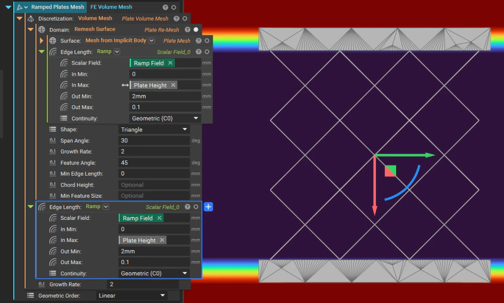 To increase accuracy, you can also use fields to drive your element size along the thickness of your wall so that they are the smallest at the interface with the lattice. This can be done by adding a Ramp block to the edge length input in Remesh Surface and Volume Mesh blocks.