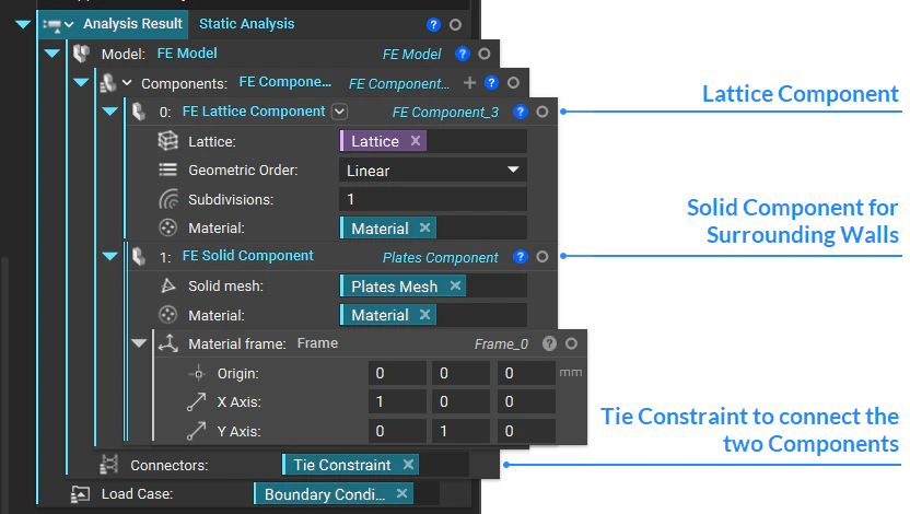 The setup for this method is mostly the same as for running static structural analysis on non-latticed parts. The only difference is that the lattice meshes as beam elements instead of as solid volumetric elements. As with any static analysis, you create an FE Model containing your component(s) and define your load case in the Boundary Conditions. You can then put the completed FE Model and Boundary Conditions into the Static Analysis block and let it run.