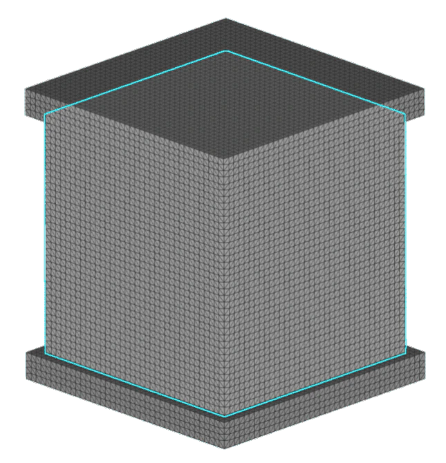 Using the homogenization result as the material for the FE Solid Component that contains an FE Volume Mesh of the bulk lattice region, create a new FE Model that joins that solid bulk component with the FE Solid Component of the surrounding walls via a tie constraint. Also, define your load case in the boundary conditions for the Static Analysis block.