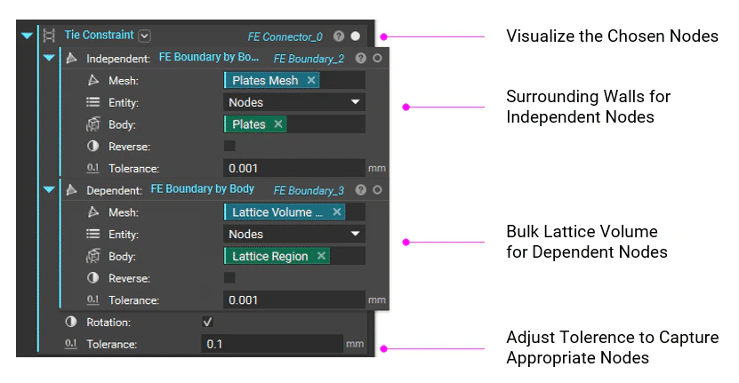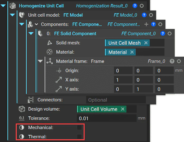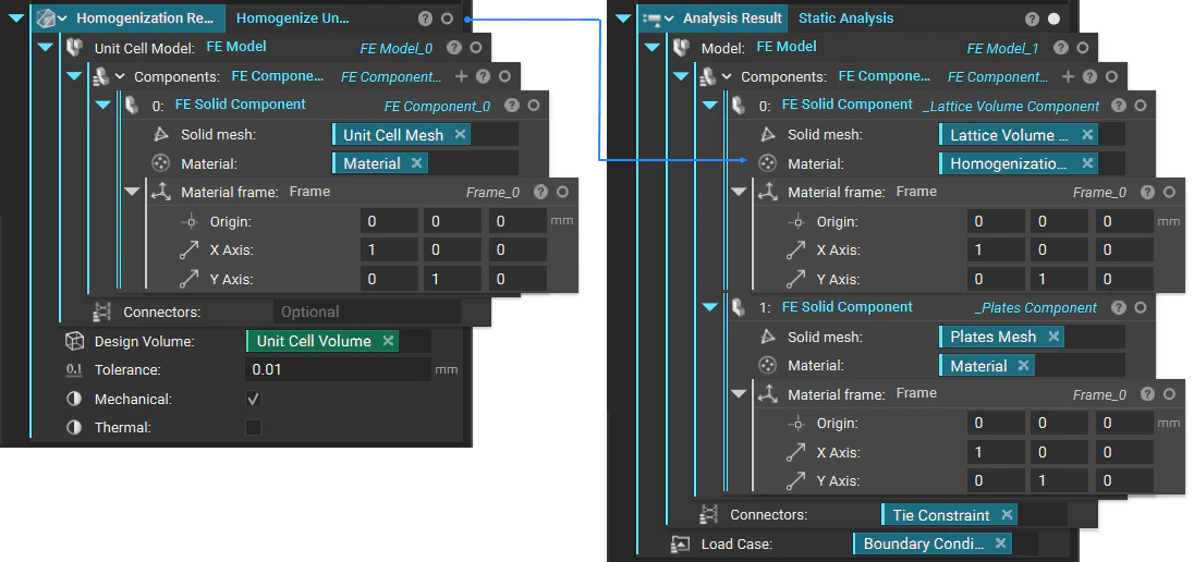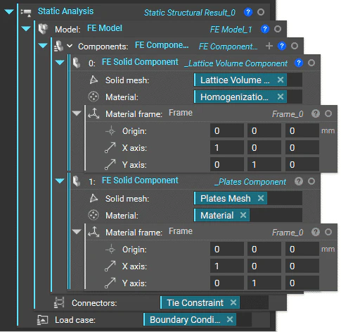 A homogenized simulation requires a two-stage set up. The first stage is running a Solid FEA simulation on a single unit cell of the lattice using the Homogenize Unit Cell block. Creating the FE Model and FE Components is the same as running normal static analysis but without the need to define boundary conditions. Then, using the results from the first simulation as the material property, run a second Solid FEA simulation on the bulk lattice structure volume. You must create a new FE Model in new FE Components to do this. The homogenization result is the FE Solid Component’s material input representing the lattice volume. This is where you define the boundary conditions.