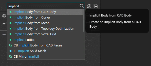 Depending on your imported file type, different blocks are available for converting parts to an implicit body. Use the search bar to explore the possible block options. You can find these conversion blocks in the Utilities tab.
