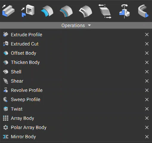 In the Modeling tab, you can find common operations such as: offsetting, extruding, shelling, thickening, and revolving. These operations may perform differently than expected on Implicit Bodies compared to traditional CAD.