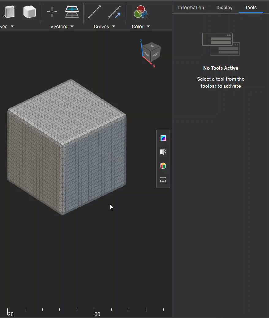 The Right Side Panel can be opened/closed by clicking the white/black rectangle icon in the top right corner of the nTop window. This panel contains three tabs: Information, Display, and Tools.