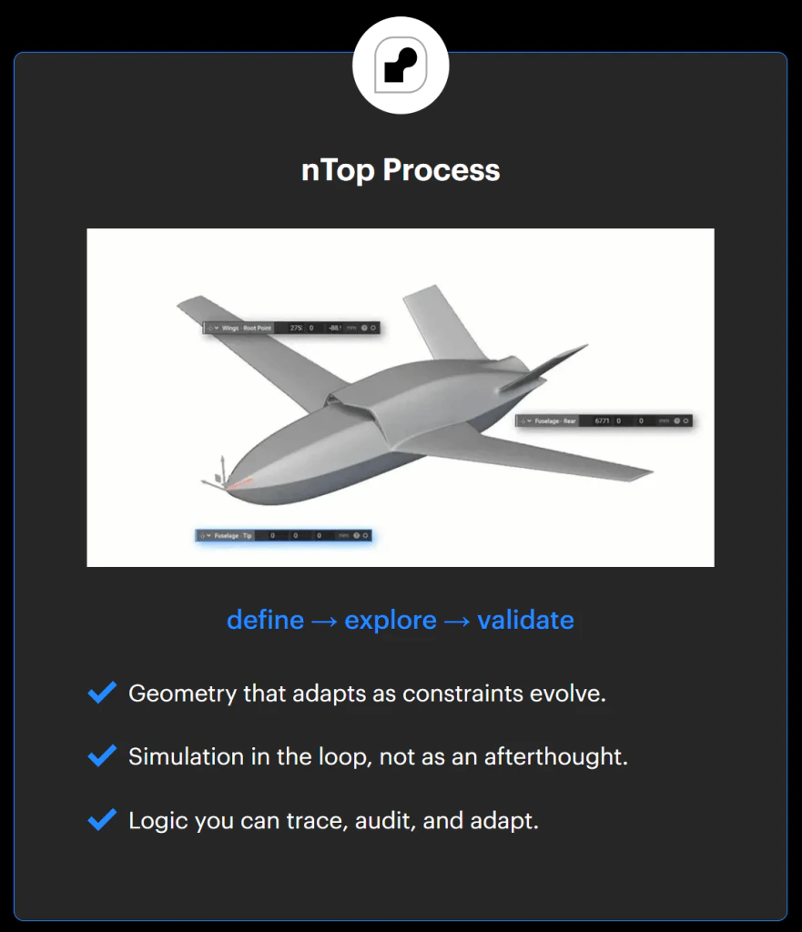 - Logic-driven workflow for scalable engineering: nTop captures engineering intent as reusable design logic similar to an executable code with input parameters that can be varied to create various design configurations. This transforms manual iteration into systematic intelligence gathering, making workflows more efficient and repeatable for large-scale projects.