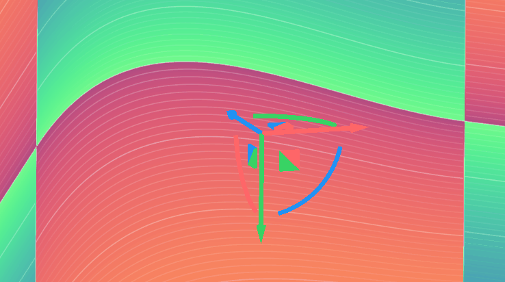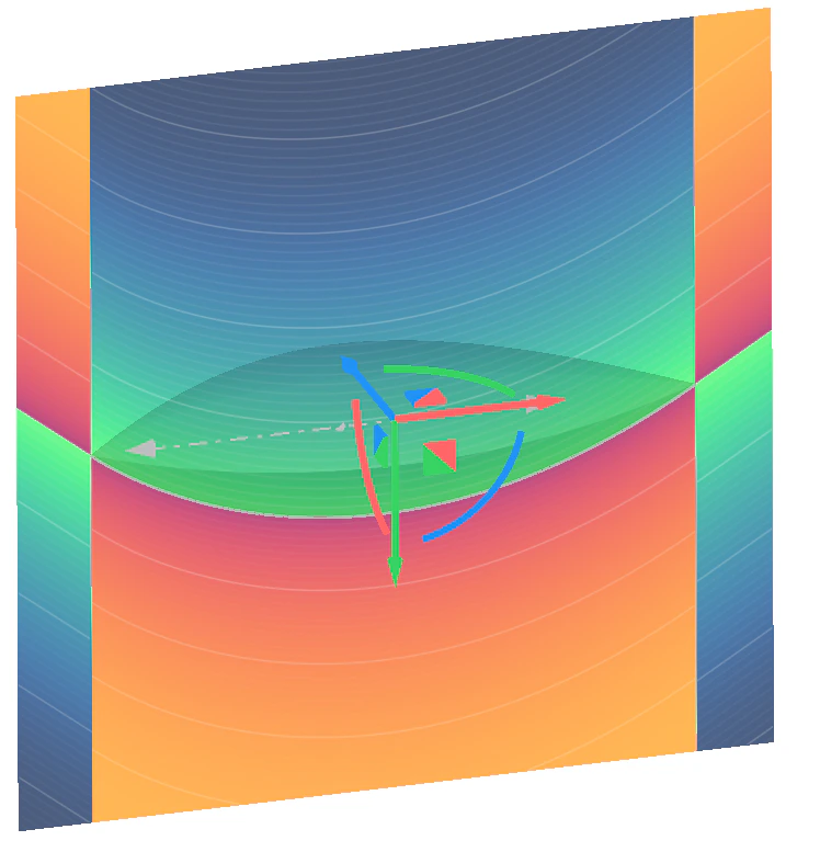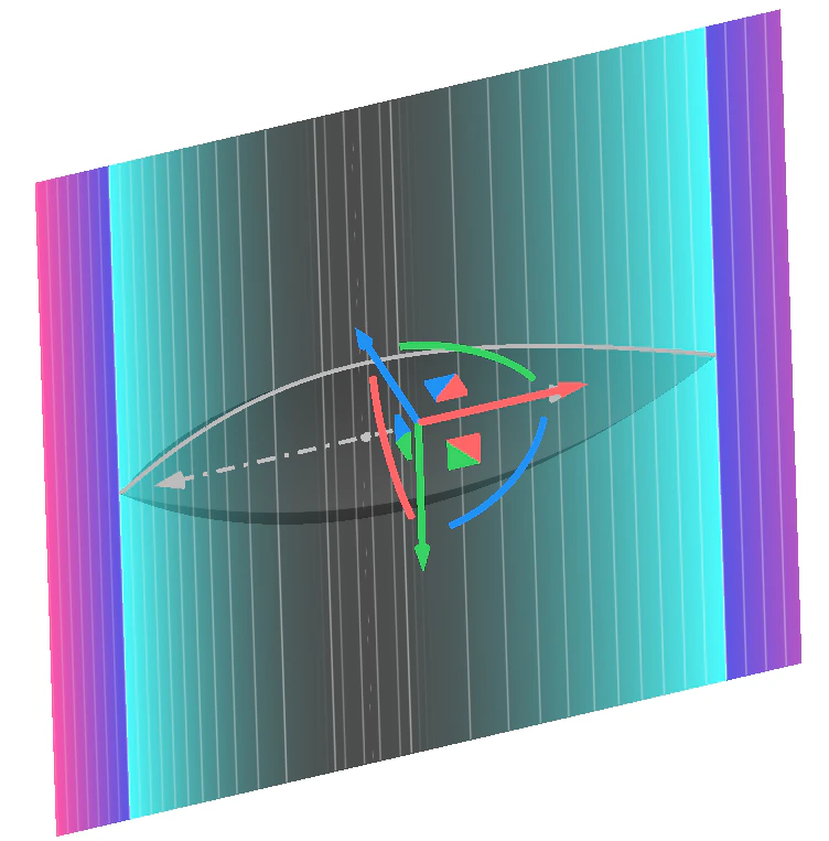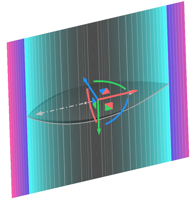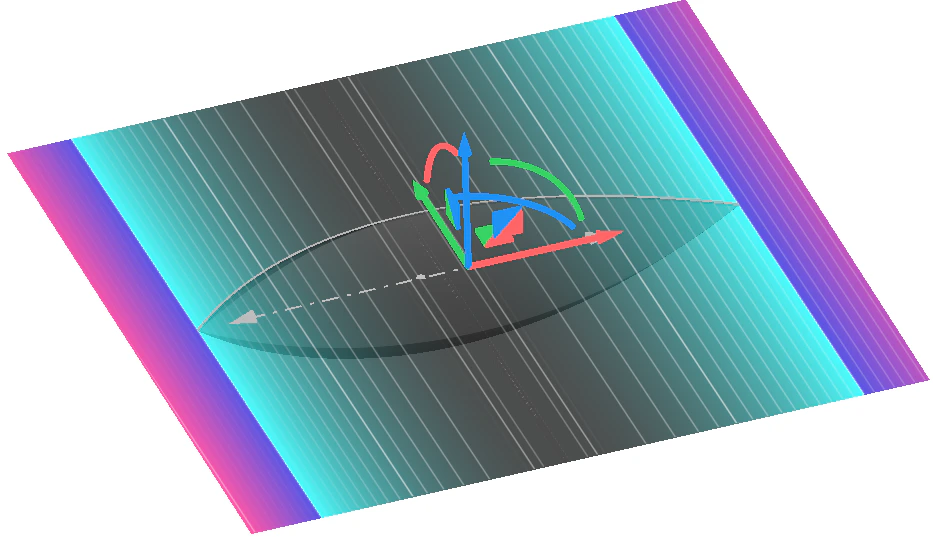 Now that we’ve established our distance fields from our central axis, we can feed them into Conic blocks to generate the top and bottom surfaces of our fuselage. To do this, we’ll drive Points 1, 2, and 3 with the Vector Field from Components blocks. For the bottom surface of our fuselage, Point 1 will be a vector field whose X component is the distance to side field we evaluated in the previous section. Our Y and Z will remain at zero.For Point 2, our X and Z will be zero, and our Y will be the distance to bottom field multiplied by -1. This will ensure that our surface falls underneath the XY plane in the negative Z direction. And for Point 3, we’ll use the mirrored version of our distance to side. So for our X, we’ll use a Multiply block with our distance to side and -1. We’ll again leave our Y and Z at zero. Our row can be any value between 0 and 1, so we’ll set it at 1 in this case. Finally, add a coordinate space for our X, Y, and Z. We’ll just pull planes from our frame variable that looks like this.Viewing the field of this bottom surface and adjusting the field viewer size and center, we can view our resulting distance field. This is going to establish the bottom surface of our fuselage. We’ll follow a similar setup for our top surface, again pulling in our positive and negative distance to side. Instead of our distance to bottom in our Point 2, we’ll use our positive distance to top. We’ll use the same coordinate space and see this resulting field.