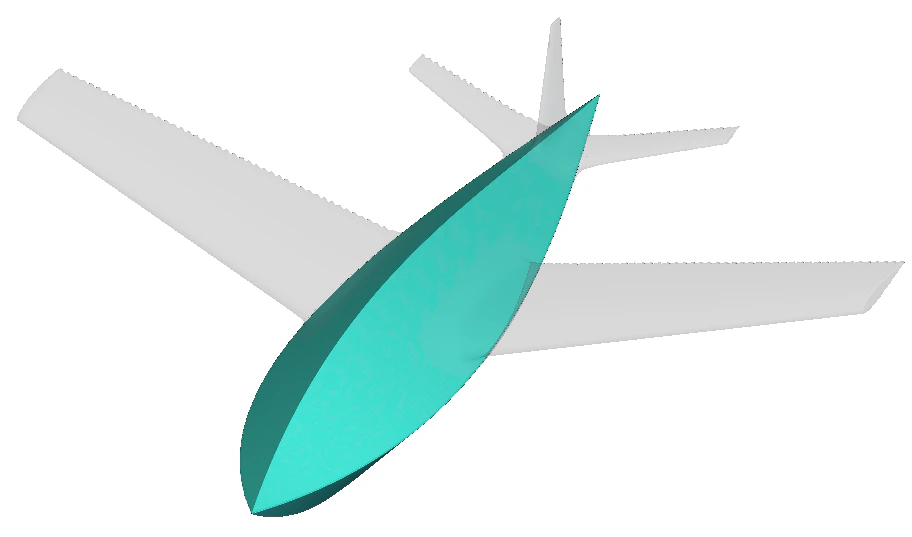 Now we’ve established conics to represent the top and bottom surfaces of our fuselage. To convert these distance fields into implicit geometry, we’ll establish bounds and use a series of boolean operations to isolate and union our fields. We begin by generating a bounding box that isolates a certain portion of our fuselage.We’ll isolate these portions one quarter at a time. Since each of our splines lies on the XY and the XZ planes, the side and the top, and the side and the bottom splines, will generate 3D bounding boxes with each of their 2D bounding boxes connected to one another. If we were to take this quarter bounding box and repeat it in each of our four quadrants to make a full bounding box, we could take that bounding box and feed it into our final body to generate our fuselage.But say the span of our bottom spline is actually larger than the span of our top spline. In that case, our full bounding box wouldn’t actually capture the entire geometry we want to create. Therefore, we can use an If-Else block to create our ideal bounding box. To do this, we can drag the span in the Z direction from the top and the bottom splines that we created. These will exist in our properties under Bounding Box Span and Y and Z.We make these into variables for visibility and we can feed them into a Greater Than block to output a true or false for our span condition. We feed that boolean output into our condition in an If-Else block. Then if our top spline has a larger span in the Z direction, we output a bounding box in our top quadrant. And if our bottom spline has a larger Z-span, we output a bounding box in our negative Z quadrant. Since right now our top spline is larger, this If-Else block will output our top quadrant.We’ll use another If-Else block with that same span condition to then output our fully mirrored box. Our top spline being bigger, and we’ll take that quarter Bounding Box Max Point and generate a second point that outputs this box from corners.If instead of our top spline having the larger Z, our bottom Z were larger, giving us a false span condition, our quarter bounding box will output our bottom quadrant, and our full bounding box will look like this. We set that full bounding box by taking this point from our quarter bounding box and generating a second point using math blocks and our quarter bounding box properties.Then in our final fuselage variable with our conic field set as well as our bounding box, we can use a Boolean Intersect block to intersect the fields of our top conic and the negative of our bottom conic. Scrolling up in our workflow, we can do these fields. The top from the side.I’ll turn my transparency on so we can view our fields. Scrolling up, we can see the field of our top conic. I’ll adjust its size and view it from the side. And the bottom conic will look like this.Viewing the negative of its scalar field, we see a field that looks like this. So if we intersect these two fields, we end up with this. Outside of our design space, we see these overlapping fields. So our last step is intersecting this field with our full bounding box that we created above. That generates this geometry which is a fully enclosed negative field that gives us our final fuselage.