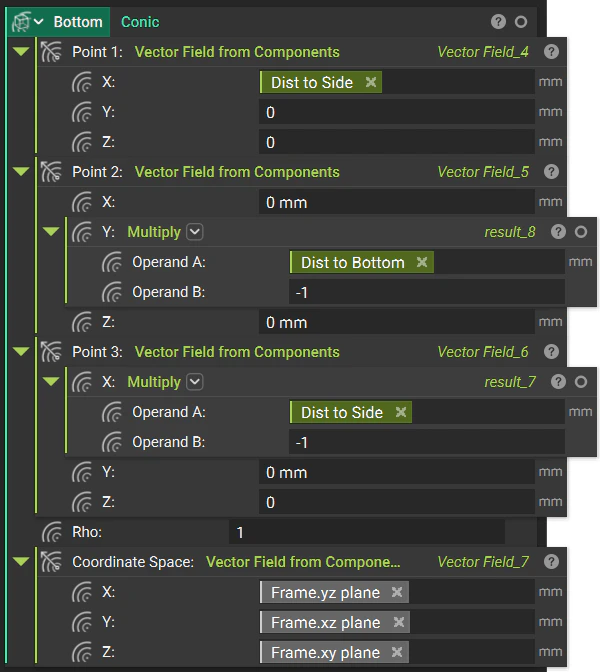 Now that we’ve established the distance fields from our Central Axis, we can feed them into Conic blocks to generate the top and bottom surfaces of our fuselage. The conic surface creates smooth, controlled blending among three defining points, making it ideal for aircraft fuselage geometry. We’ll use Vector Field from Components blocks to define Points 1, 2, and 3 of our conic. For the Bottom surface:- Point 1 uses our distance to side field as the X component (with Y and Z at zero)
