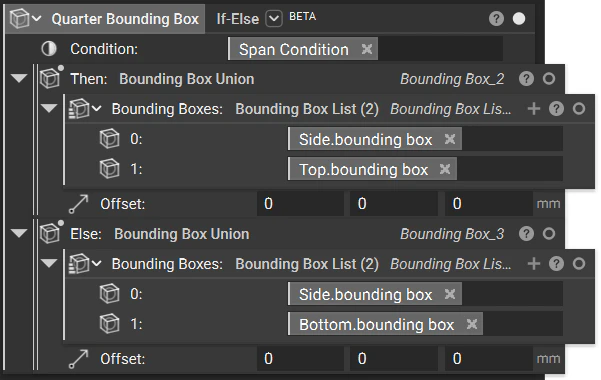Now we’ve established conics to represent the top and bottom surfaces of our fuselage. To convert these distance fields into implicit geometry, we’ll establish bounds and use a series of booleans to isolate and union our fields. We begin by generating a bounding box that isolates our fuselage geometry. We will do this by combining the 2D bounding boxes from our Side and Top or Side and Bottom splines using the Bounding Box Union custom block below. This outputs a Quarter Bounding Box whose properties we then use in a Box from Corners block to generate a Full Bounding Box.