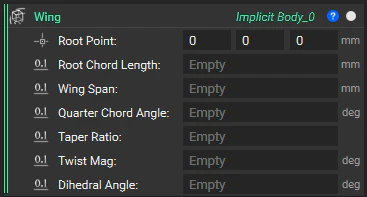 Now we have the underlying scalar field for our wings, but our field is unbounded. So we don’t actually have an implicit body yet. Let’s take this field and some of the data that we already have to generate an implicit body representing our wings.We’ll start by generating our wing plan form as a profile. This profile will be made up of six curves: two each for the leading and trailing edges and one each for the wing tips. We’ll start with a line for our first wing tip, which just extends from the end point of our leading edge to the end point of our trailing edge. We can then mirror that line using this simple Mirror Line block that just mirrors our start and end points across a plane and generates a new line from the result.Then we’ll add in our leading edge and our trailing edge and then rotate each of those using the Rotate Object blocks. We’ll rotate those 180° around our x-axis or our fuselage. Our result will be a platform that looks like this. And we can use that profile’s dimensions to generate some implicit body that we can then intersect with our scalar field that we created in our previous section, resulting in a solid body.We’ll take the minimum and the maximum x components of our points from that profile. Assign our Y components as the positive and negative halves of our wingspan and use the maximum and minimum Z components of our air foil profile to create this box from corners. From there, we can just intersect our box with that mirrored wings field that we created before.Viewing our box in transparent mode, we now see where the intersection will happen. We’ll use our Boolean Intersect block to generate those wings.And then we’ll translate that object by our root point vector. Since we’ve set our root point to the global origin, this won’t actually move our intersect, but it’s good practice for parameterization and generalizing our custom blocks.