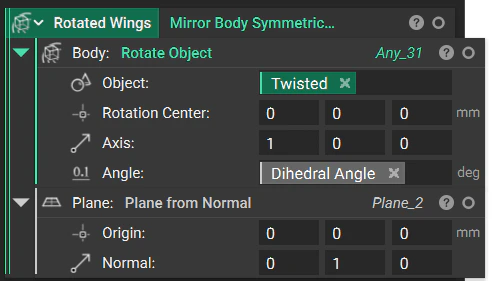 Mirror the wing setup to generate symmetric wings. Remember, the Remap field only applies to one half of our full wing setup. For the rest of our modeling operations, we want to use both halves of the wing. To do this, we need to mirror our Remap field. A standard Mirror Body block won’t work because it reflects the entire field and would return only the opposite wing, leaving us with the same issue as we see to the right: