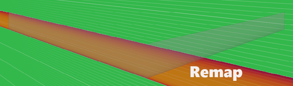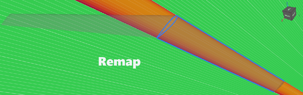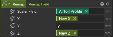 By this point, we’ve defined our leading and trailing edges, and we have the airfoil profile that we want to extrude along these edges. If we look at the field of this airfoil profile, change our color map to an implicit, and add our isolines in, we see that we’ve got this constant field that follows the Y-axis. Now we want to take this field and morph it so that it falls between the leading and the trailing edges.To do this, we’ll have to take that profile and remap its X and Z components to scale that profile as it moves along the Y direction. The results of our Remap Field block should look something like this. Note that our new isolines would remap so that they’re conformal between the leading and trailing edges. And we have a new X and Z component while our Y is going to stay the same. So in this parameterization section, we’ll see our new X, our new Z, and the same Y that we had in our original airfoil profile. Let’s start with the new X. Here we’ll use the custom block provided called Single Panel Wing Parameterization. Our inputs here will be the leading and trailing edges and our root chord length.Right-clicking and opening this custom block, we can see the underlying operations. We start with two fields, one for our leading edge and one for our trailing edge. And these are just going to be sign distance fields radiating from either of those two curves. We then use the Distance To Curve From Axis block to measure each curve’s distance from the Y-axis along the X direction. This will output two separate scalar fields, one for the distance to the leading edge and one for the distance to the trailing edge. We then feed these into scalar fields A and B where in A we would subtract X from the distance to the leading edge and multiply that by -1. And in B we would just subtract X from the distance to the trailing edge.Let’s look at an example of what this might look like. I’ll scroll to the top just to test this out, double click and add my single panel wing edges just to create a test case. And from my list elements, I’ll want to pull in my leading edge and my trailing edge. I’ll pull these into my notebook and pull them in to test.Now, if I look at my distance to leading edge, I’ll see a field that looks like this. Starting at zero and moving to 800 or half of my wingspan, my distance to trailing edge field will look like this. My A field will look like this and my B will look like this. Now I take that A and B and feed them into this Two Body Field block that essentially finds the midsurface between those two A and B input fields. To look further into that Two Body Field block, you can always right-click and open your custom block.Now from that field, I see that I’m at zero at my center, -1 at that trailing edge and positive one at the leading edge. To pull that zero to one of my edges, then all I have to do is subtract one from the field we’re viewing. And now I see that my zero falls along this leading edge. Now my field ranges from 0 down to -2. And if I take my root chord length and divide it by -2, then multiply by the field we’re viewing, I’ll see this result. My field now spans from zero at my leading edge to about 1,200 at my trailing edge. This is going to be my new parameterized X field. So going back into my notebook, I can take that new X and drop it into our remapped field.For my new Z, I can expand this block and I can again use this Distance To Curve From Axis block. We’ll now measure our distance in the X direction to the Y axis from our trailing edge and from our leading edge. We’ll subtract the leading from the trailing then divide by our root chord length.Now we see the field equal to one at our original profile and 0.5 at the tip of our wing. Note that this is going to match our taper ratio of 0.5. We then take the reciprocal by dividing that by 1. And now we go from 1 to two at our tip. We can multiply that by Z. And if we take that new Z and drop it into our remap block, that’ll mean that the Z height scales in this case by 0.5.Now, viewing the results of our remapped field, I can use the Field Viewer and see how my X and my Z have scaled along this Y direction.