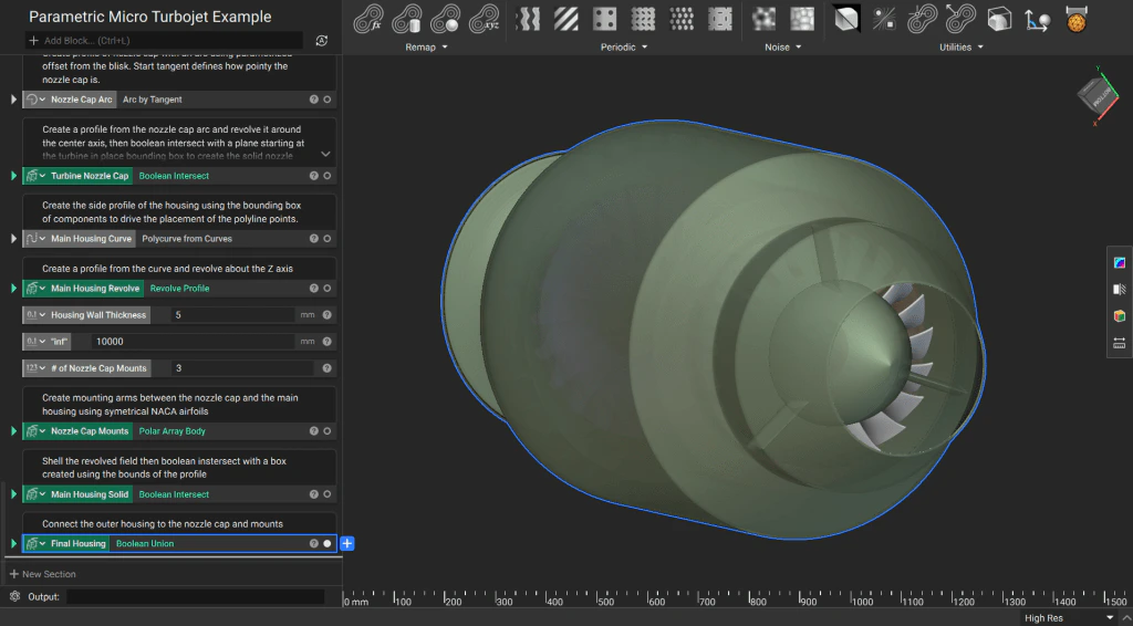 The housing must encapsulate all internal components while allowing for specific wall thicknesses. Construct the Side Curve: Use the Polyline block and arcs to create the housing profile. Parametrize these curves based on component bounding boxes plus required offsets. Note: In production workflows, these curves are often driven by first-order equations governing the engine’s performance requirements.