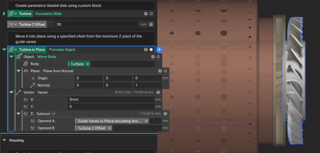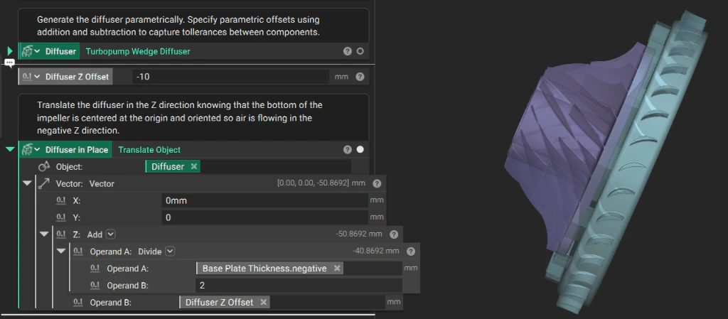 In a parametric assembly, component locations should reference a common origin or the dimensions of adjacent parts to ensure the model updates correctly when parameters change. Establish a Reference Point: The Impeller custom block generates the base of the impeller at the origin (0, 0, 0). All subsequent components use this point as their primary reference. Capture Tolerances: Use variables and basic math to define fits. For example, set the Impeller Max Radius as a variable and add a tolerance value to drive the Wedge Diffuser Inner Radius. Use the Translate Object block to position the Wedge Diffuser. Since the original block centers the diffuser on the origin, translate it along the Z-axis by half the base plate thickness plus an offset tolerance. Tip: Access the Bounding Box properties of a block (such as themin or max points) to drive placement