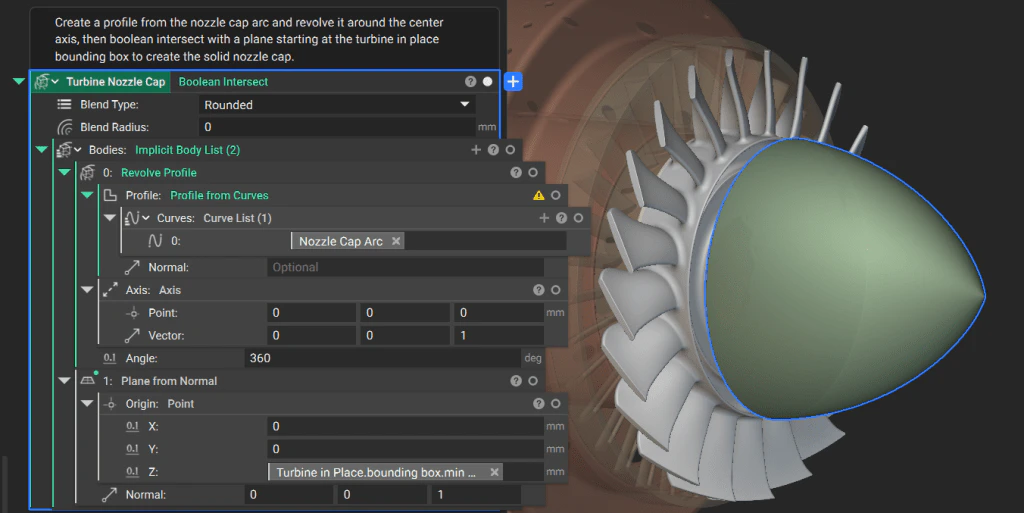 The nozzle cap directs exhaust flow and is defined by the dimensions of the turbine wheel (Blisk). Define the Profile: Generate an arc for the nozzle cap side profile. Parametrize its points using themin Z point and inner diameter of the Blisk.